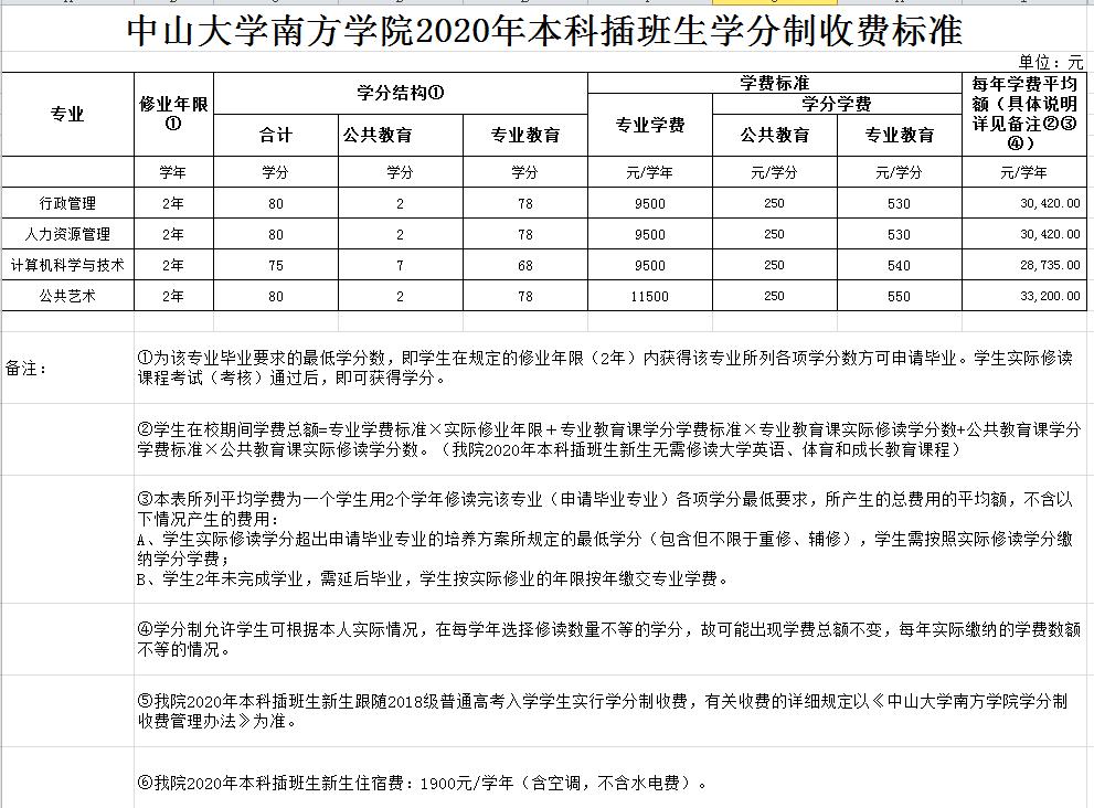 2020年本科插班生学杂费标准