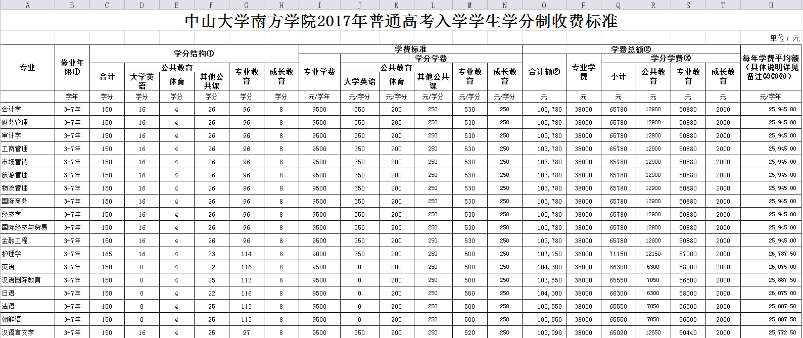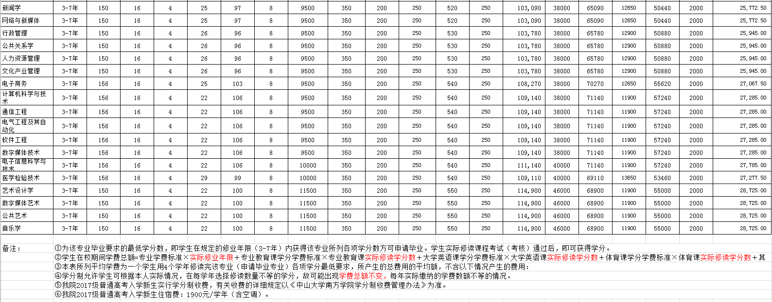 中山大学南方学院2017年普通高考入学学生学分制收费标准